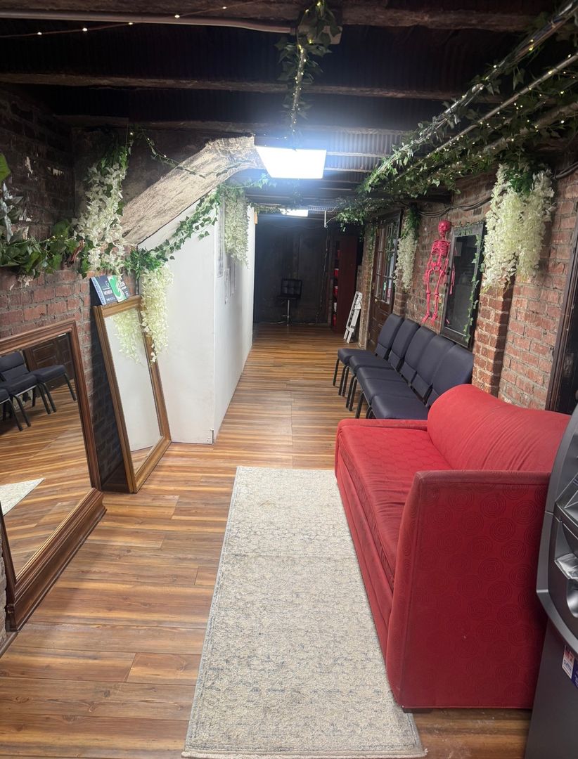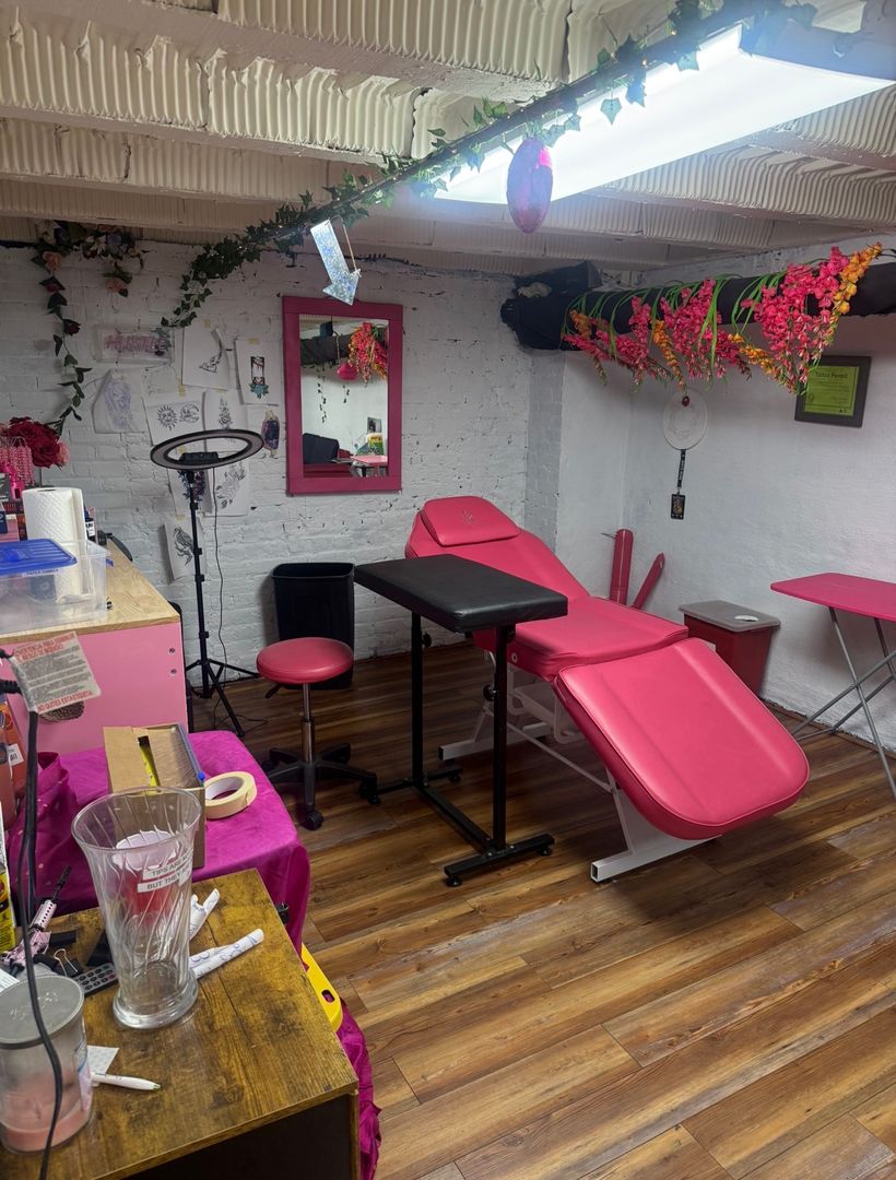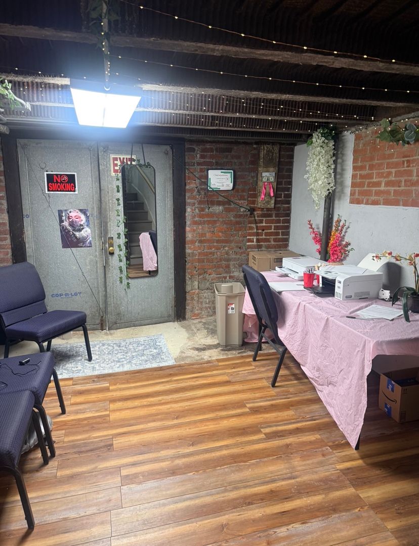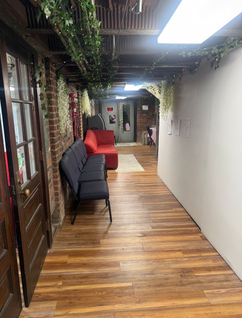 The suite features a large open work area complemented by two private offices, providing the perfect balance of collaboration and privacy. With water connections and sinks already in place, the space is especially well-suited for personal service, wellness, studio, or specialty retail concepts. It is currently operating as a tattoo studio, demonstrating its functionality for hands-on, client-focused businesses.